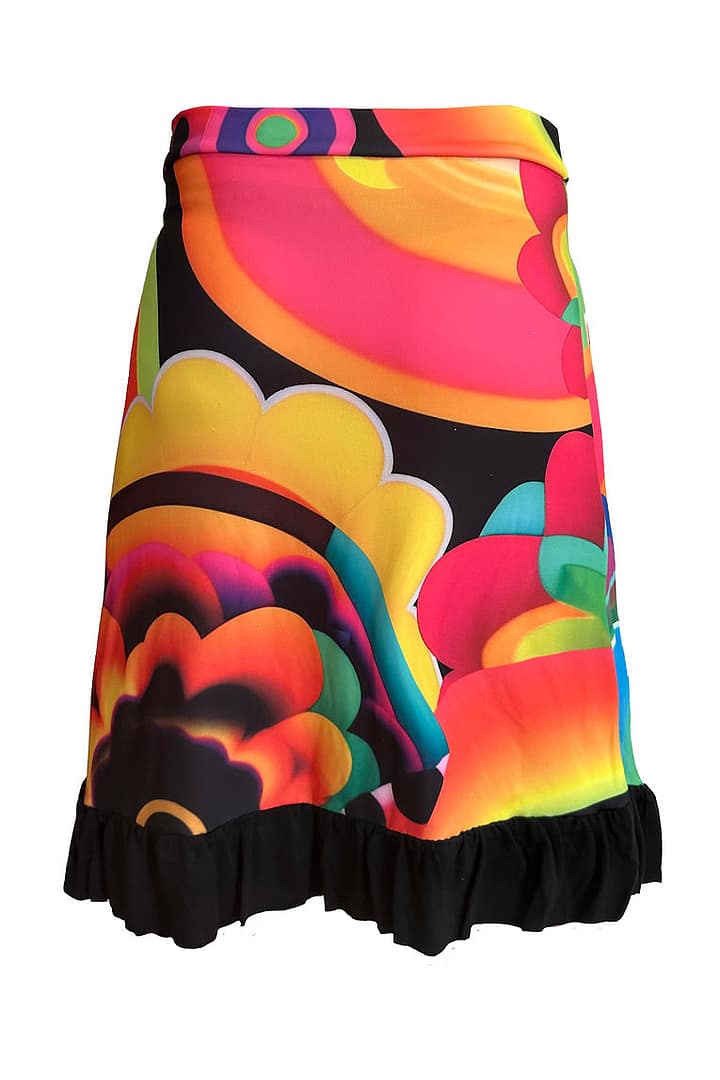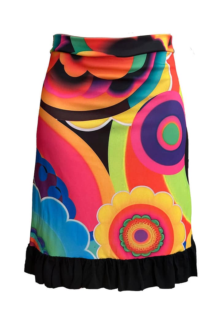 Fotografía de una falda con volantes negros en la parte de abajo y en el resto de falda círculos y flores de colores vivos y vibrantes.