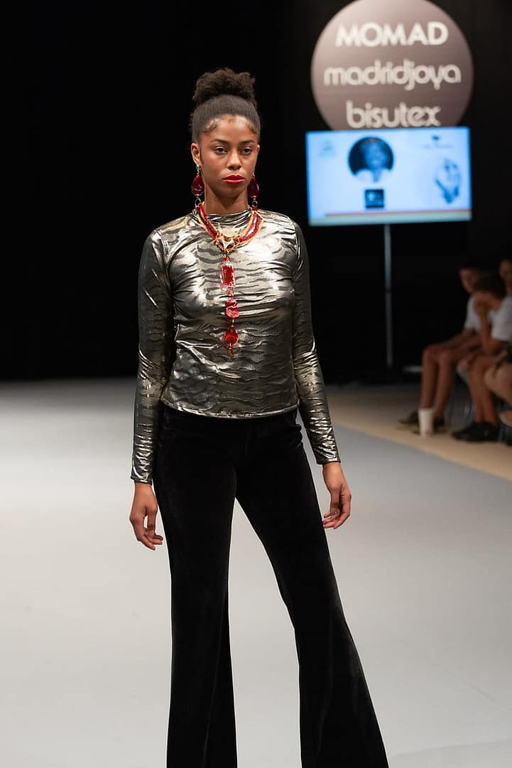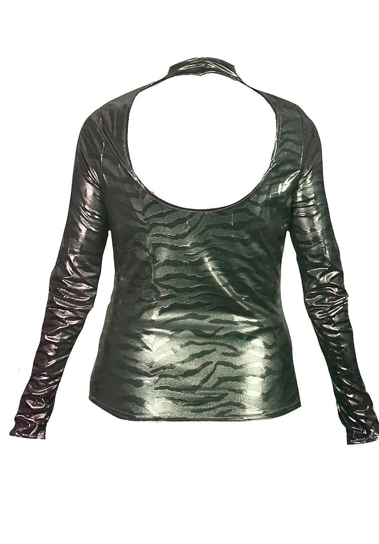 Mujer con un jersey zebra dorado y unos pantalones negros.