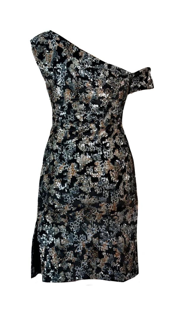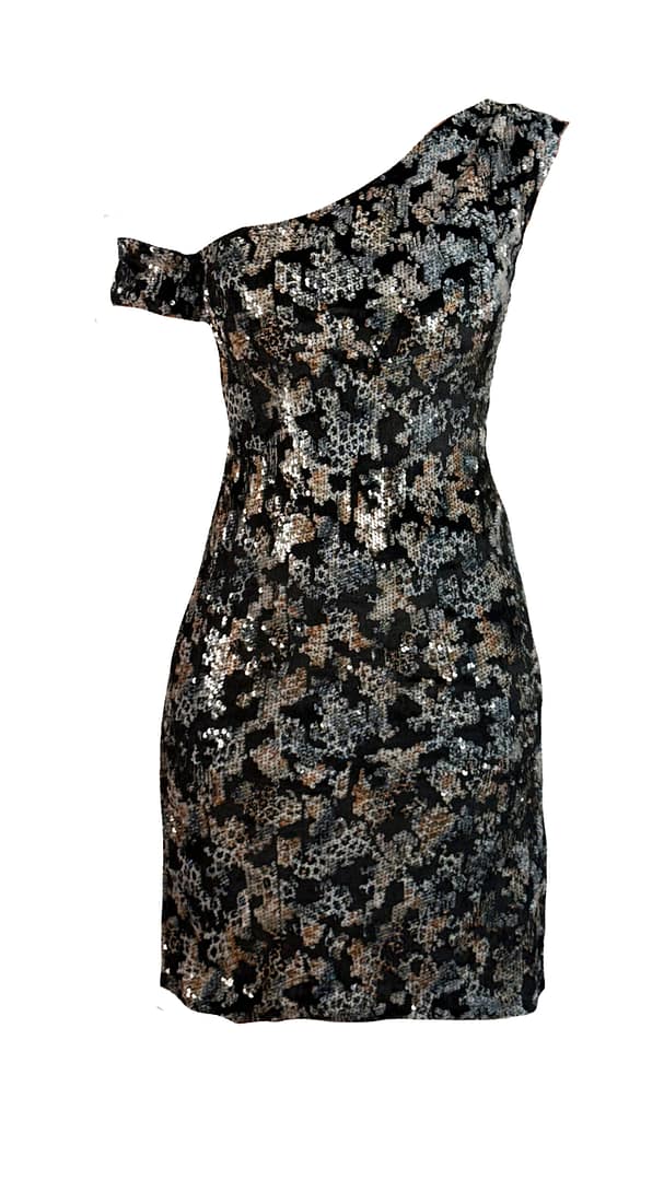 Vestido recto con escote asimétrico, muy elegante porque es de lentejuelas haciendo la forma del estampado de animal print.