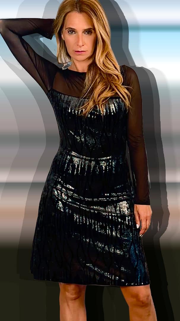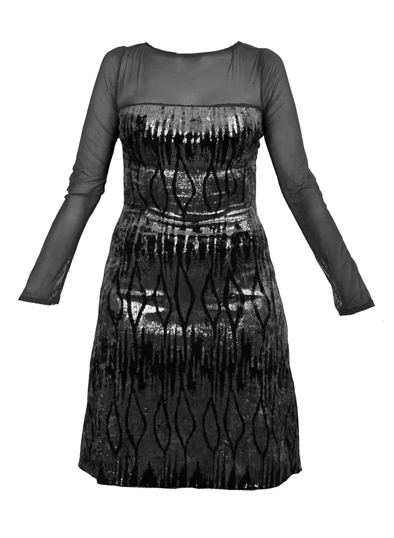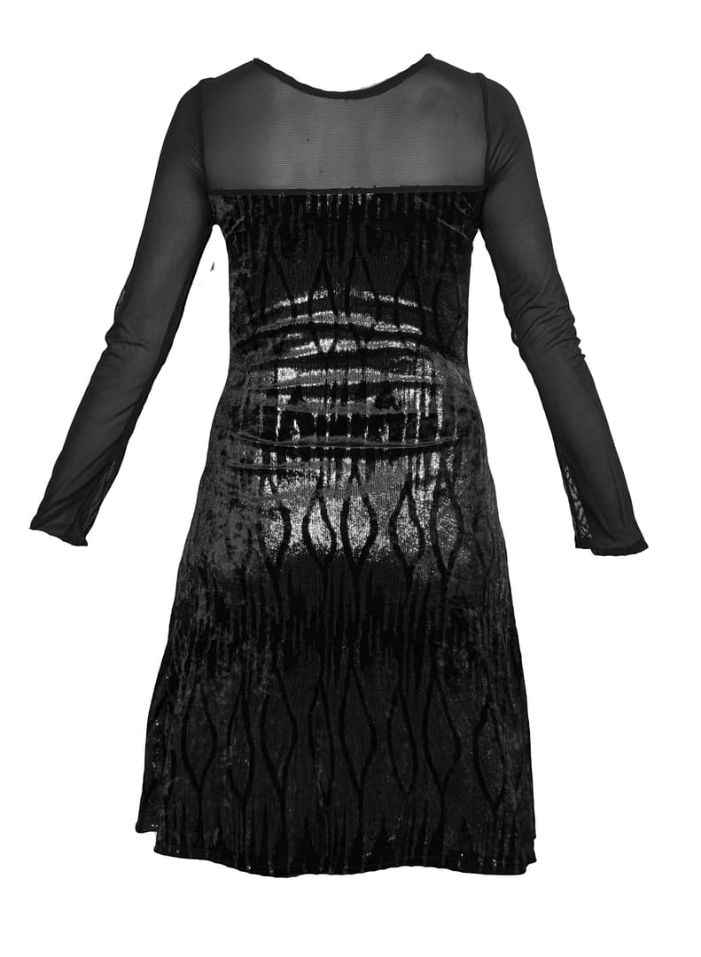 Vestido con escote y mangas de tul elastico, muy elegante porque es de terciopelo negro y plateado, entallado y la falda evasé.