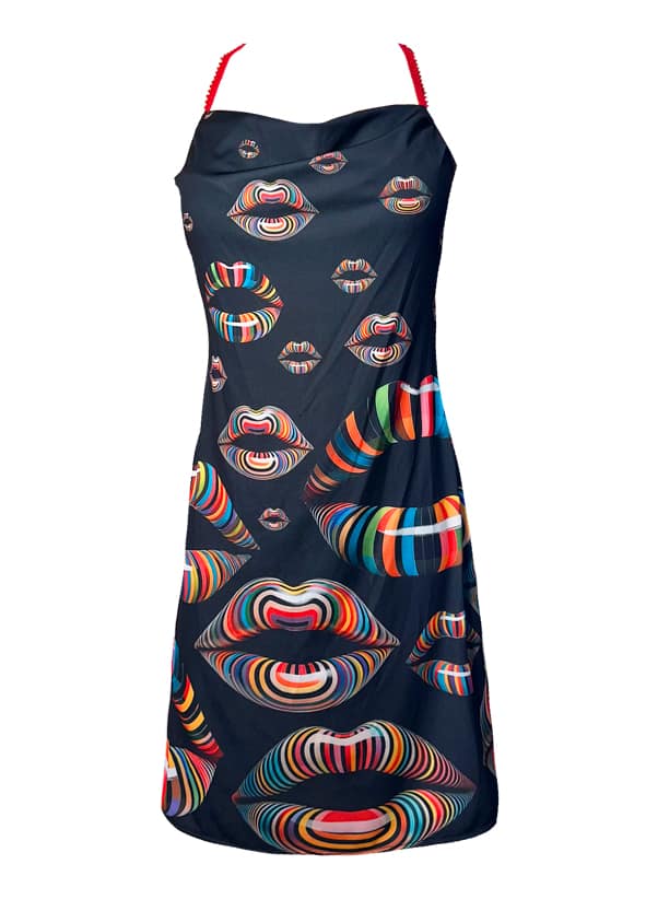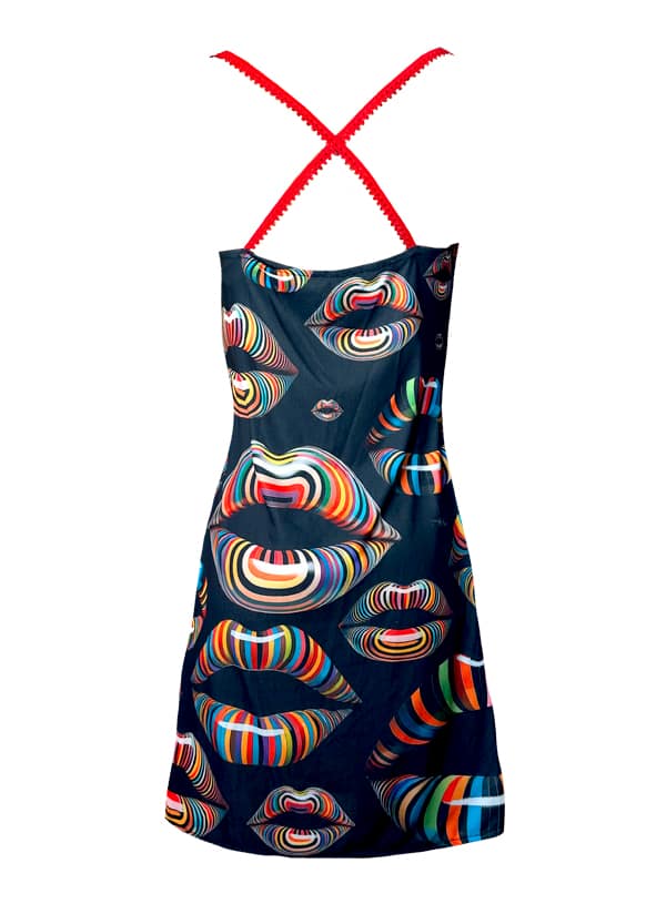 Vestido en escote caído, tirantes rojos y largo por la rodilla. De punto de viscosa, muy agradable y fresco, super cómodo y elegante, estampado original de labios.
