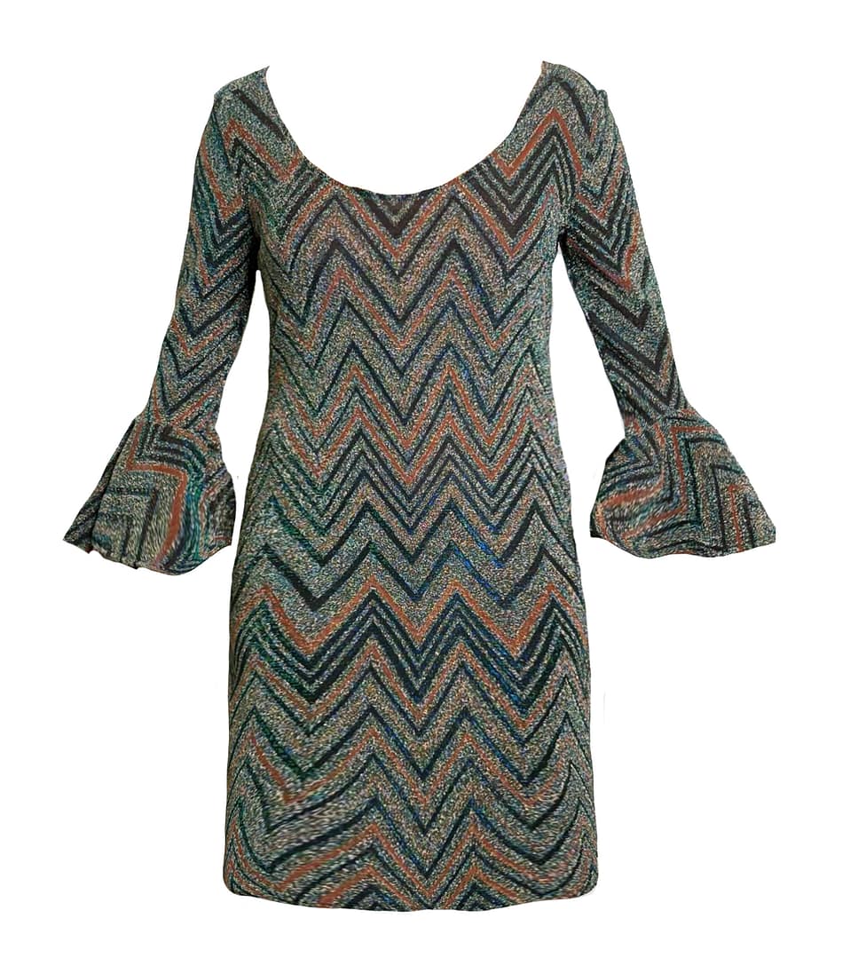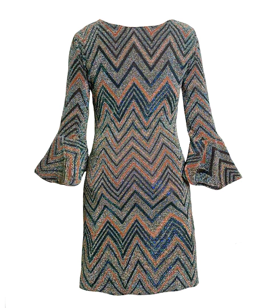Vestido recto con mangas acampanadas y largo por la rodillo, muy cómodo porque es de punto de lurex y elegante.
